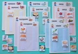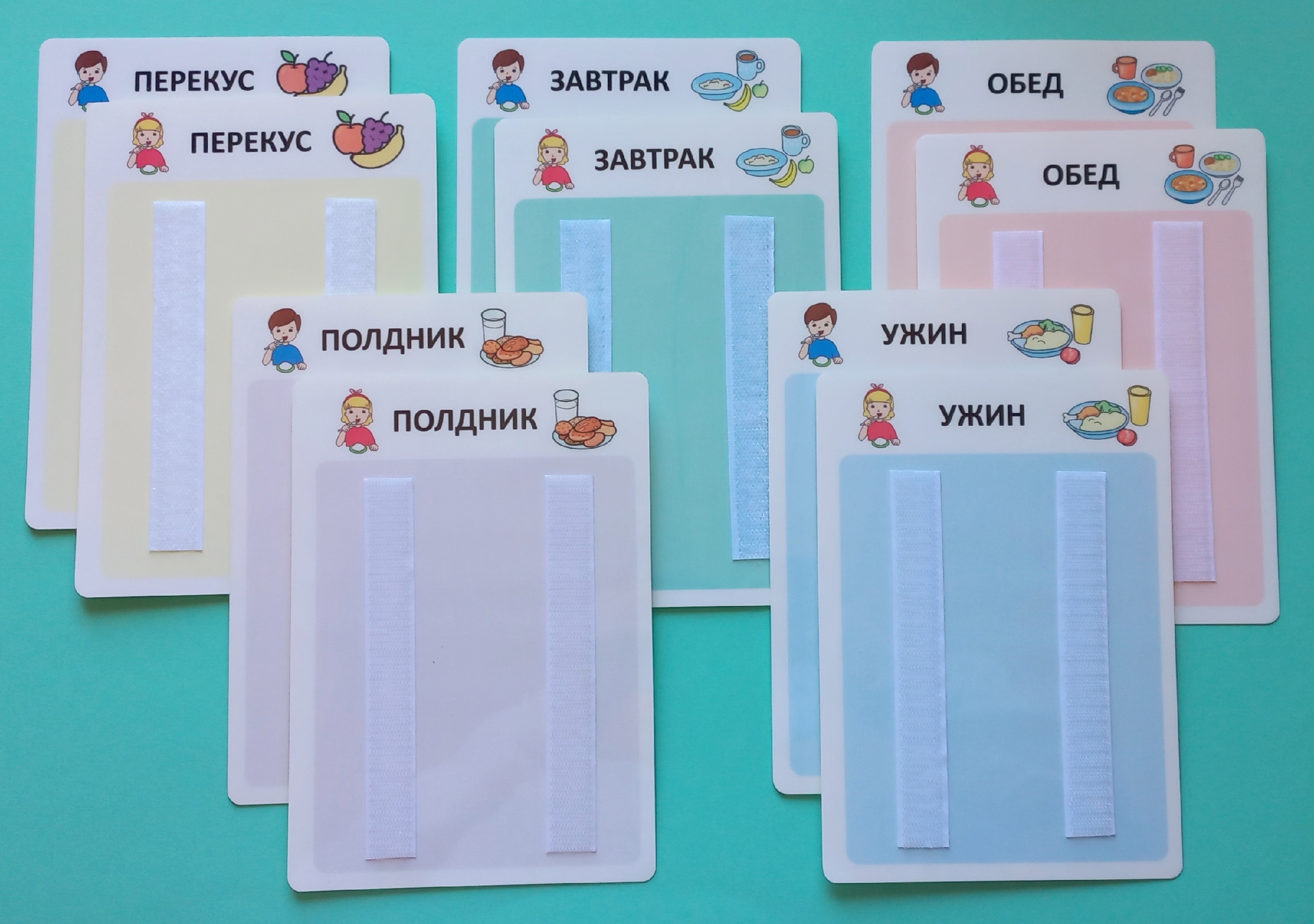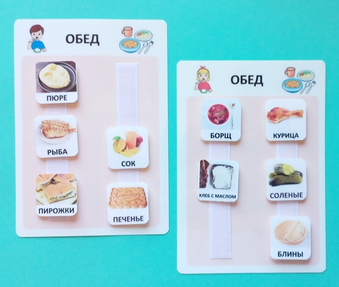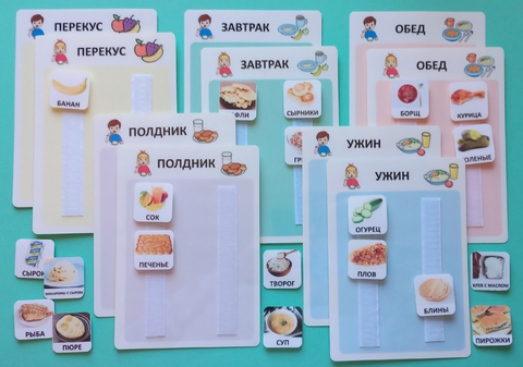 В состав комплекта входят: 5 панелей А5 формата для девочки (завтрак, обед, ужин, полдник, перекус) и 5 панелей для мальчика. Материал изготовления пластик.