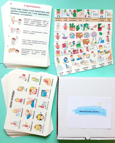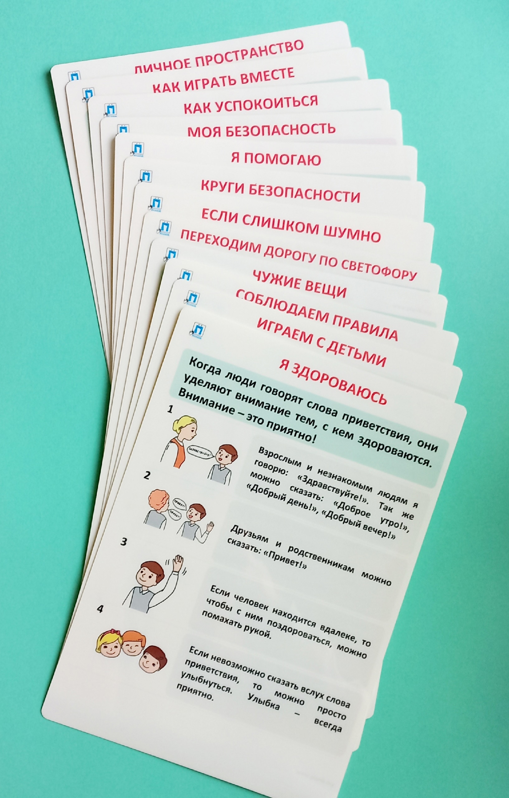 Социальные истории (12 шт): Здороваюсь, Как успокоиться, Личное пространство, как играть вместе, Моя безопасность, Я помогаю, Круги безопасности, Если слишком шумно, Перехожу дорогу, Чужие вещи, Соблюдаем правила, Играем с детьми.
